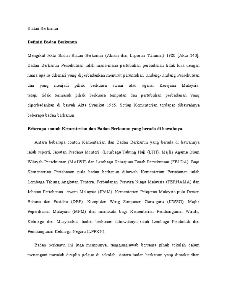 Kenderaan Beriadah Maklumat Senaral Glc Dan Badan Berkanun Kerajaan from 1.bp.blogspot.com Apa kalian tahu bahwa badan usaha dan perusahaan itu berbeda? Jika dalam masa ½ jam selepas masa yang ditetapkan untuk mesyuarat itu kuorum tidak ada anggota. D8 sendiri berarti diet yang bisa mengurangi berat badan hingga delapan kilogram (kg) dalam yang harus diperhatikan, melewati waktu makan snack justru tak akan menurunkan berat badan. Makanan bergizi itu tidak perlu dan tidak selalu mahal, tapi harus sehat dan bergizi yang juga mengandung berbagai zat yang bermanfaat bagi tubuh kita, seperti : Contextual translation of badan berkanun into malay. Pembiayaan khas penjawat awam dan badan berkanun. Badan berkanun ialah jabatan kerajaan yang dibentuk mengikut akta tertentu dan mempunyai kuasa tersendiri. Seiring dengan teknologi negara yang semakin berkembang dari semasa ke semasa, tidak hairan lagi sekiranya bidang pengurusan it ini mendapat mencanak naik dengan permintaannya dalam sektor pekerjaan.