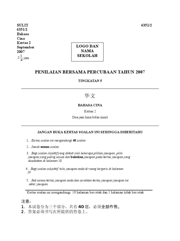 Spm Bahasa Cina 2019 : Bahasa melayu (bm), bahasa inggeris (english)